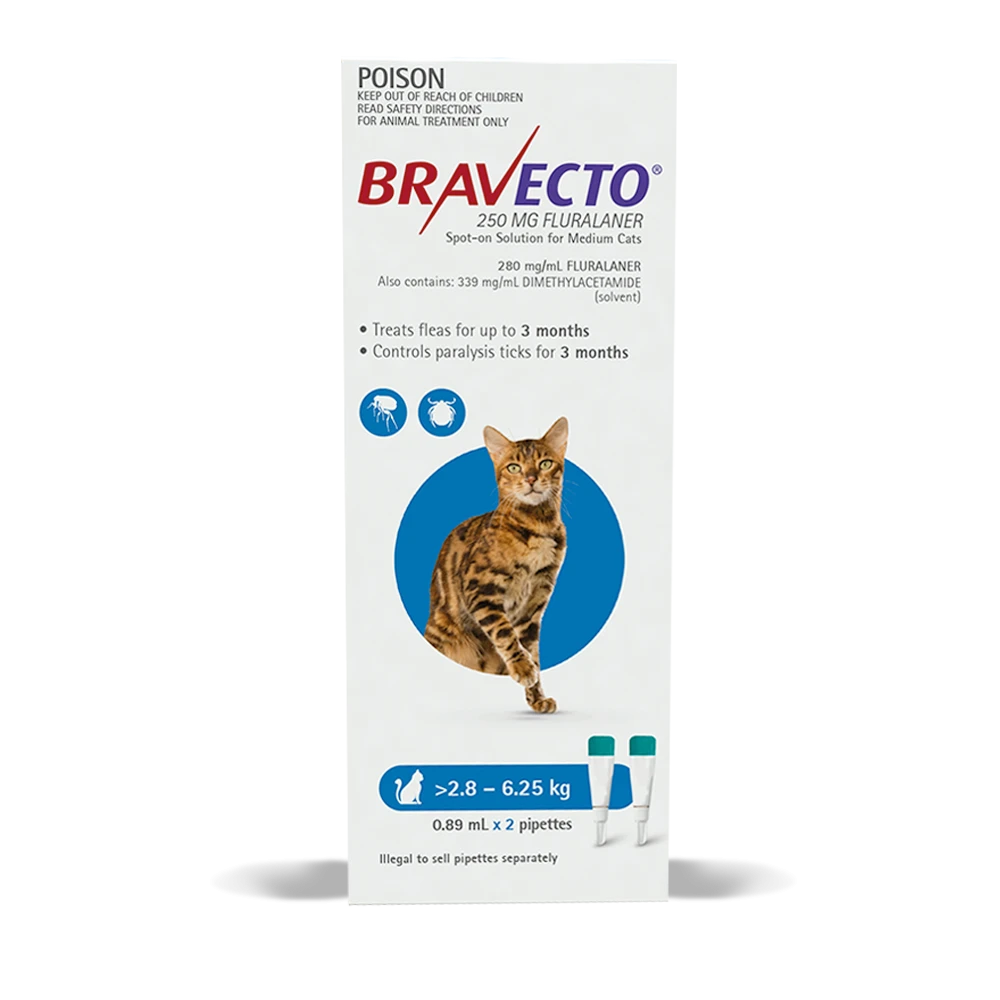 Bravecto Spot On for Cats offers long-lasting flea and paralysis tick protection for your cat. A single treatment provides up to 3 months flea and paralysis tick protection with one spot-on. Each pack contains 2 treatments.