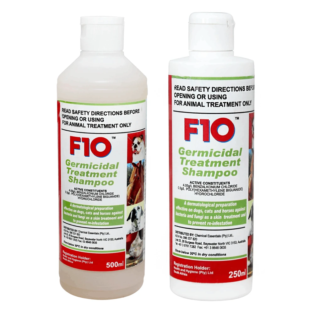Pack Sizes: F10 Germicidal Treatment Shampoo is available in 250mL and 500mL pack sizes.
