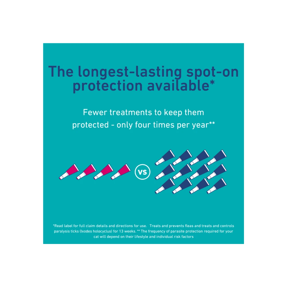 - Safeguard your cat against fleas and ticks with a convenient three-month treatment.