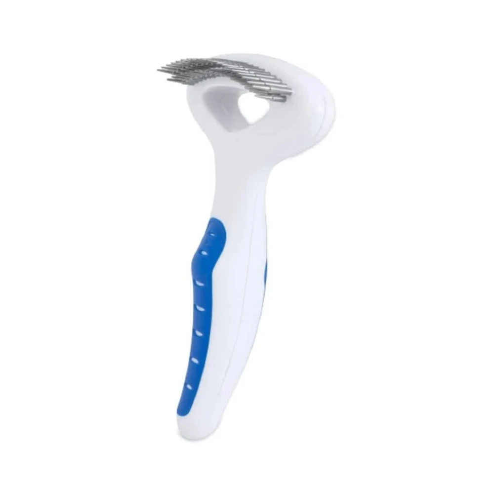 - Double row of round-tipped teeth loosens lightly matted areas.
