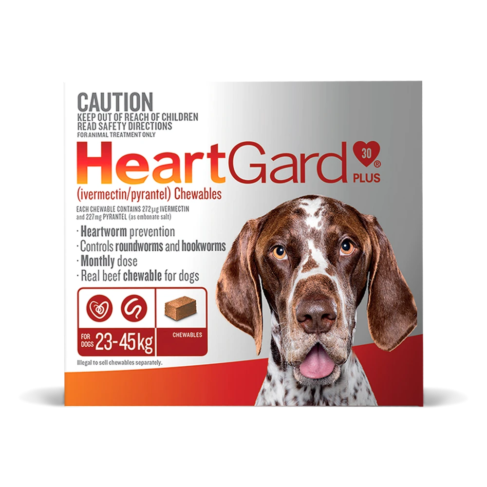 Weight Chew per month Ivermectin Pyrantel Colour Up to 25 lbs 1 68 mcg 57 mcg Blue 26 to 50 lbs 1 136 mcg 114 mcg Green 51 to 100 lbs 1 272 mcg 228 mcg Brown - Heartgard Plus is safe for puppies aged 6 weeks and up.