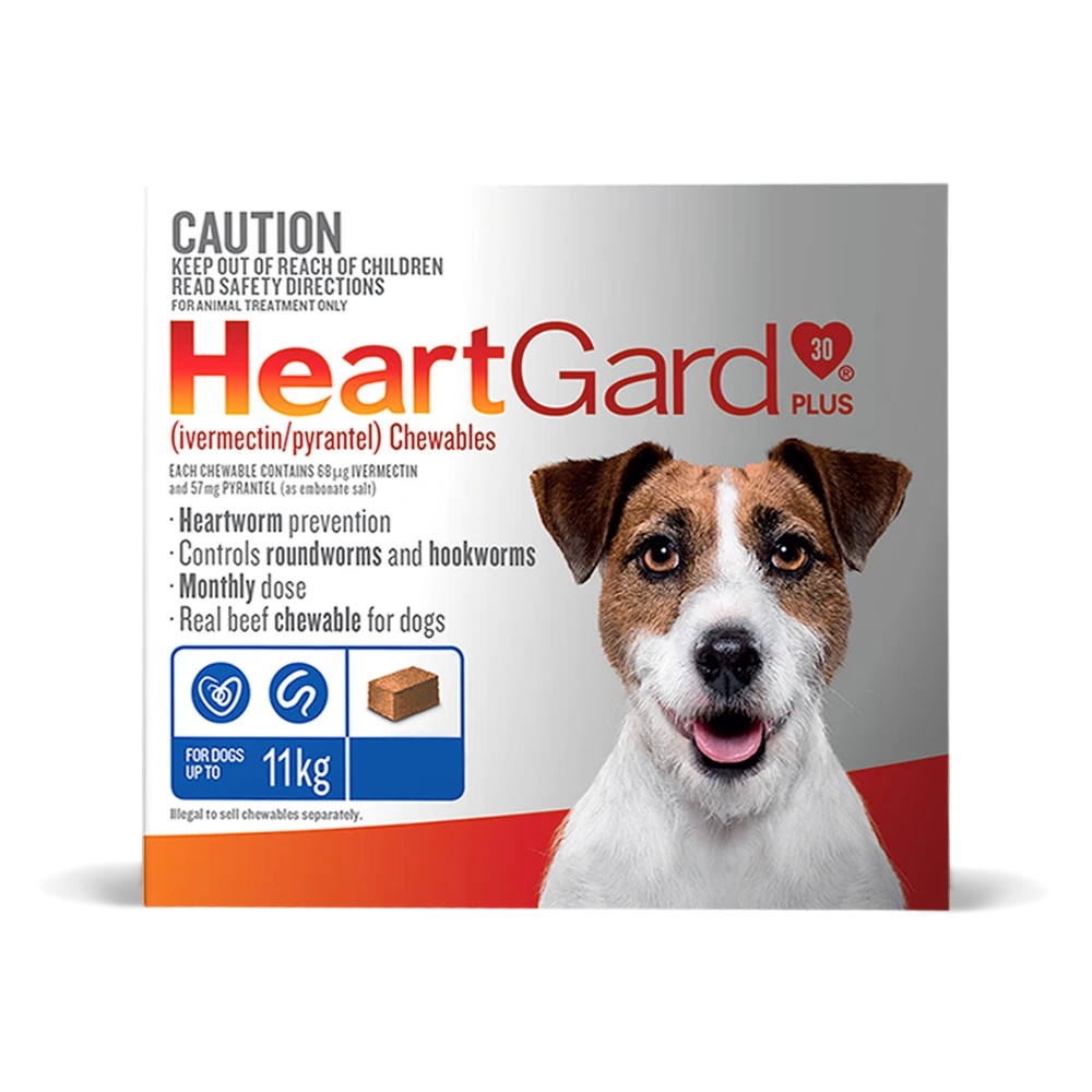Weight Chew per month Ivermectin Pyrantel Color Up to 25 lbs 1 68 mcg 57 mcg Blue 26 to 50 lbs 1 136 mcg 114 mcg Green 51 to 100 lbs 1 272 mcg 228 mcg Brown - Heartgard Plus is safe for puppies aged 6 weeks and up.