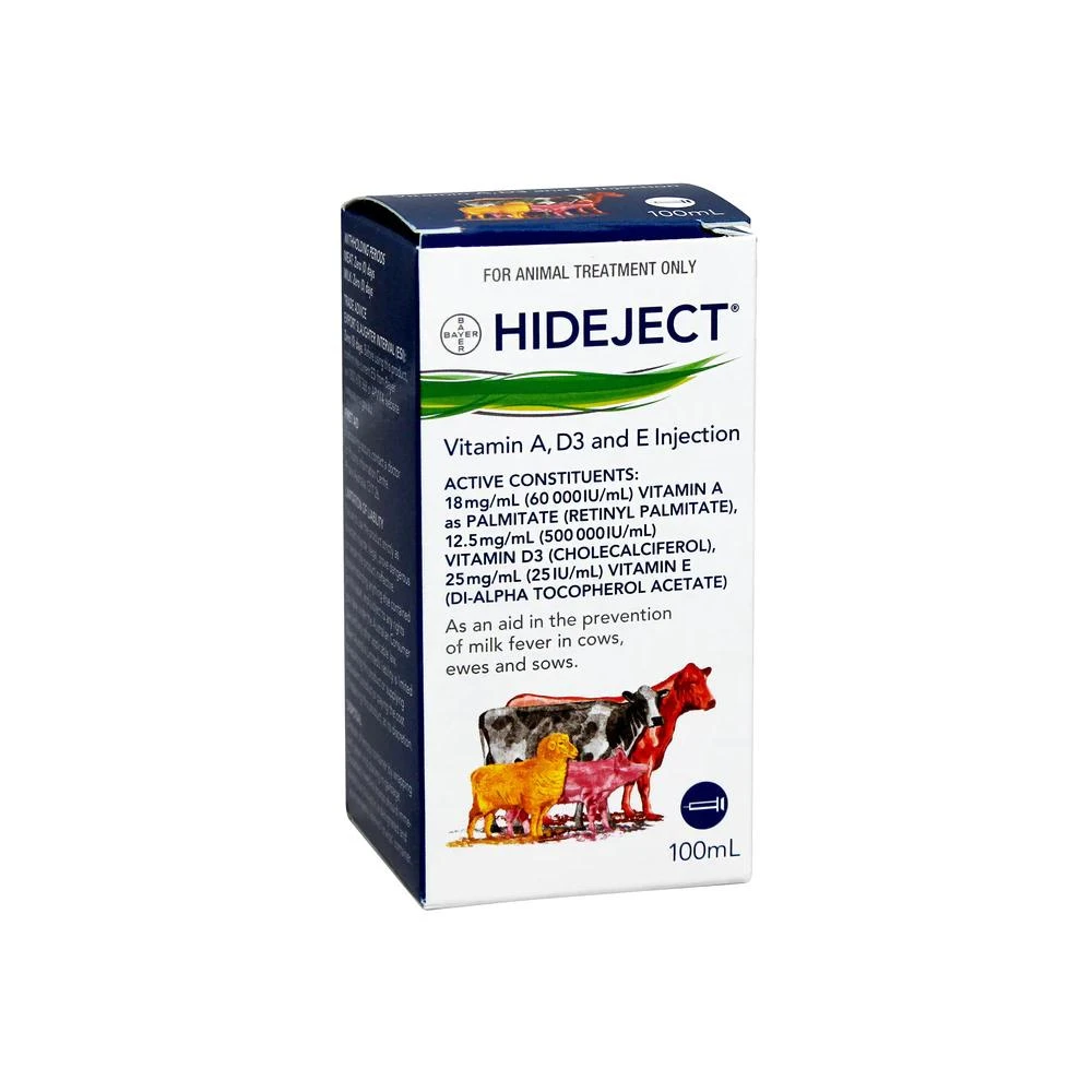 Hideject Vitamin ADE Injection 100mL is a specially formulated injectable solution designed to aid in the prevention of milk fever in cows, ewes, and sows. This solution contains essential Vitamins A, D3, and E, each playing a crucial role in maintaining animal health and fertility.