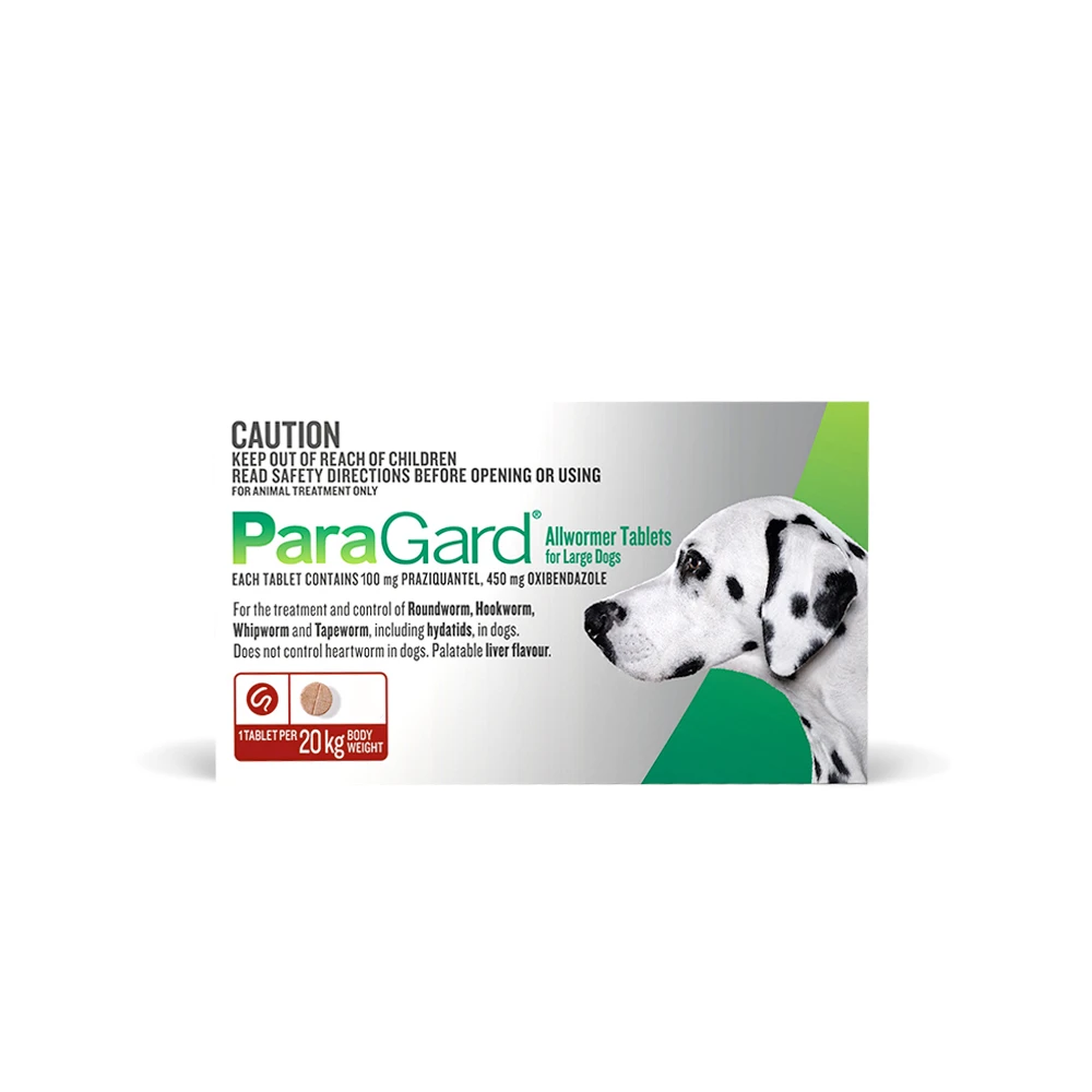 Paragard Allwormer Tablets for Large Dogs Up to 44lbs (Red) is a tablet for the control of all common gastrointestinal worms in dogs including roundworm, hookworm, whipworm and tapeworm (including hydatid tapeworm). Each pack contains 3 tablets.