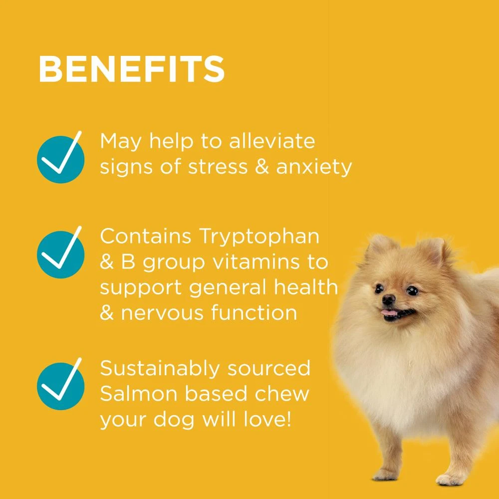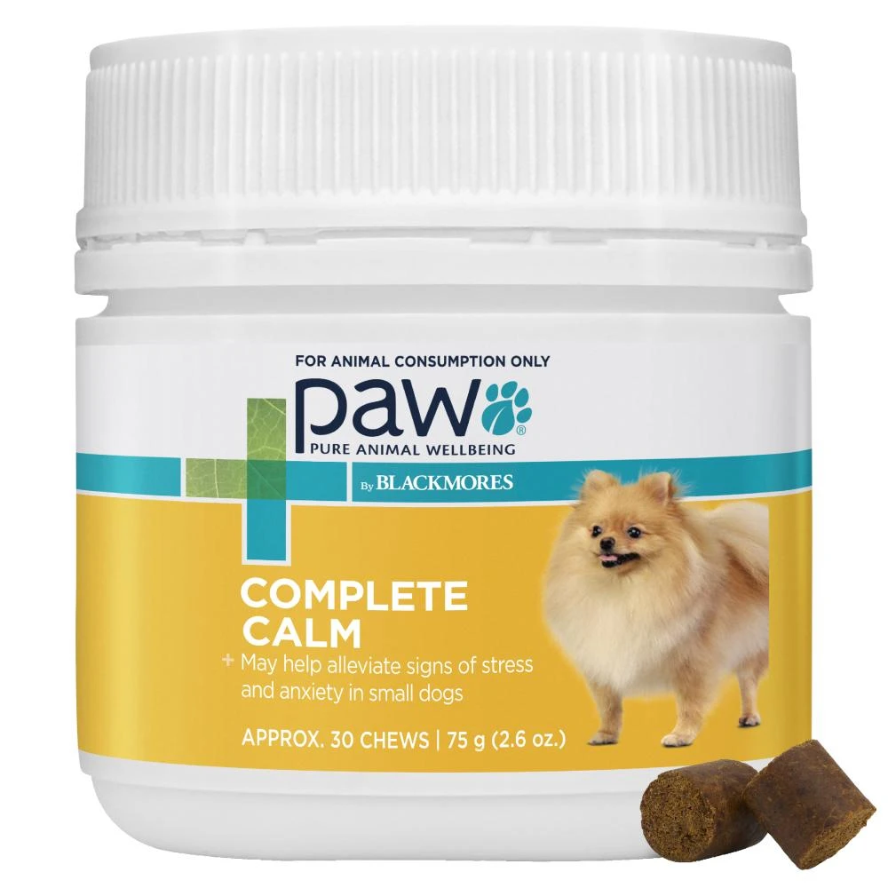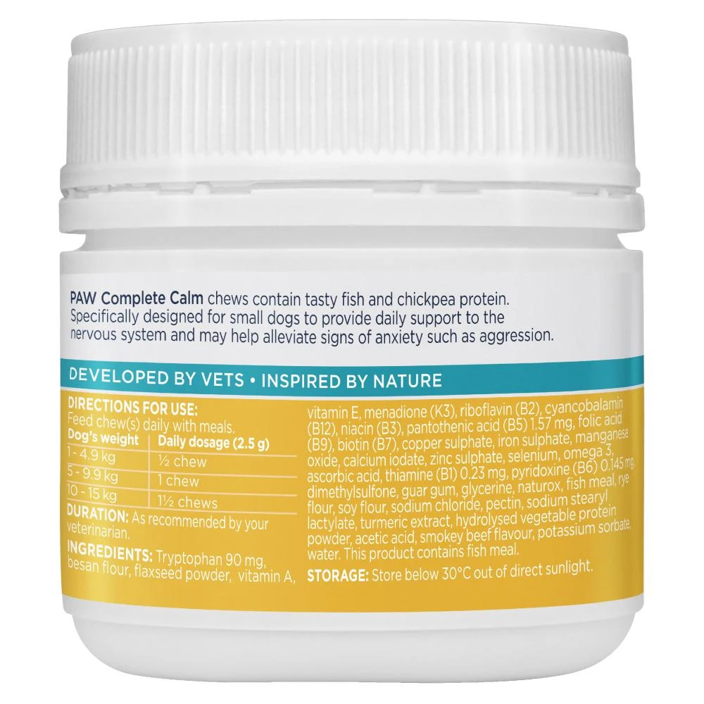 PAW Complete Calm for small dogs soft and tasty fish and chickpea based chews contains protein, Tryptophan, B group vitamins, designed specifically for small dogs to support nervous system. This may help alleviate signs of anxiety such as aggression.