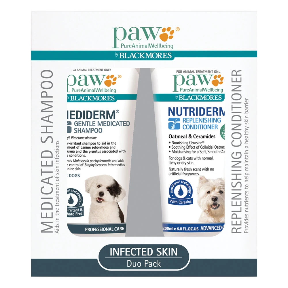 PAW Infected Skin Duo Pack takes a dual approach to treating bacterial and fungal skin infections by combining Mediderm Shampoo and Nutriderm Conditioner.