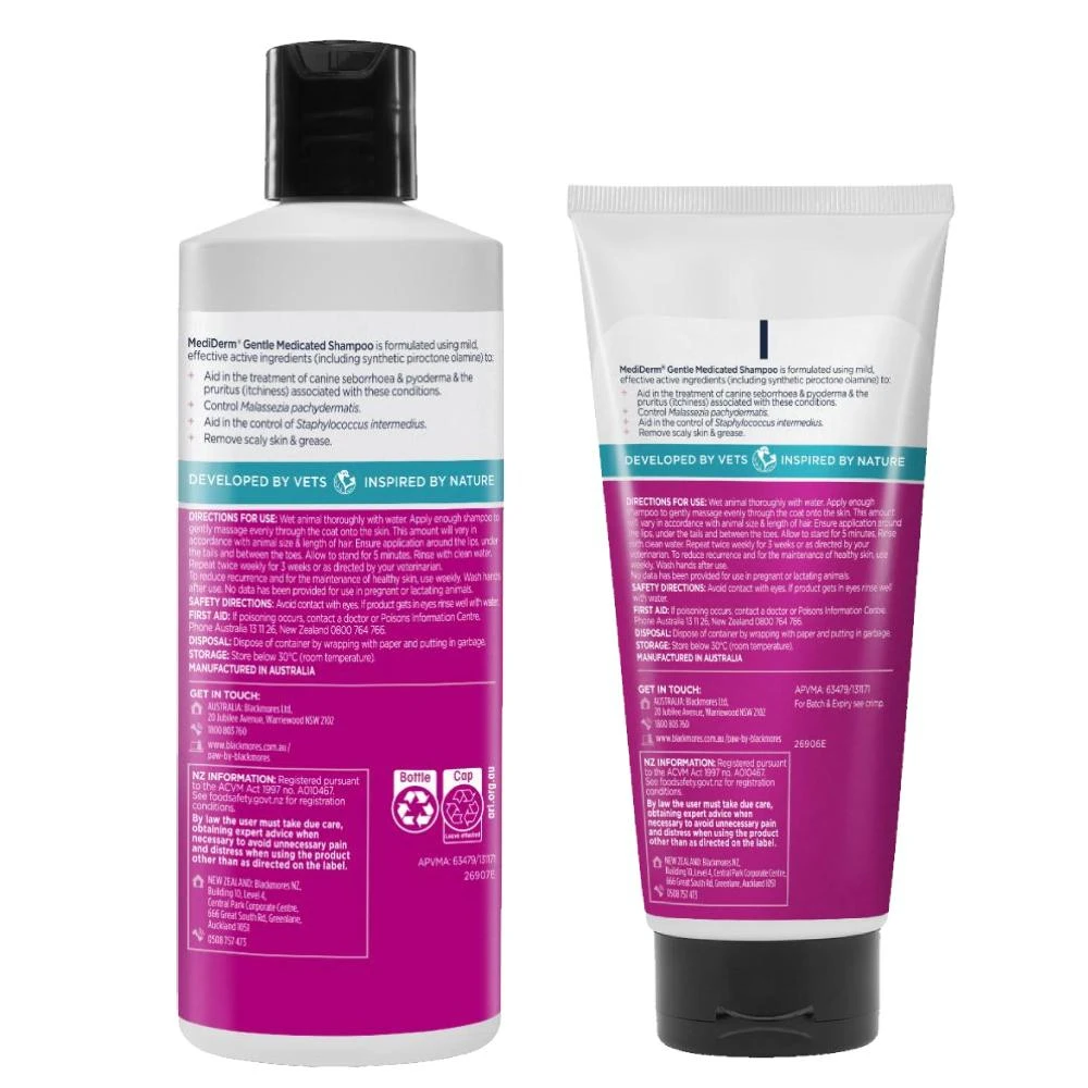 PAW MediDerm® is a low-irritant shampoo formulated with mild, effective active ingredients (piroctone olamine) which helps in the treatment of canine skin infections and remove scaly skin and grease.