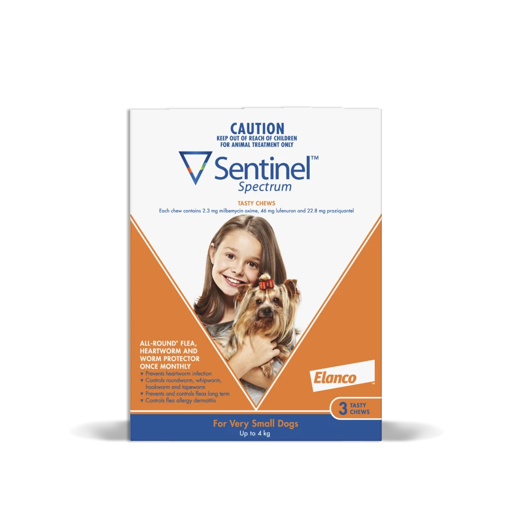 Sentinel Spectrum Tasty Chews for Dogs is a once a month meaty chew for the prevention of heartworm disease and control of roundworm, whipworm, hookworm and tapeworm in dogs while also providing long term protection and control of flea infestations, and treatment of flea allergy dermatitis in dogs.Â