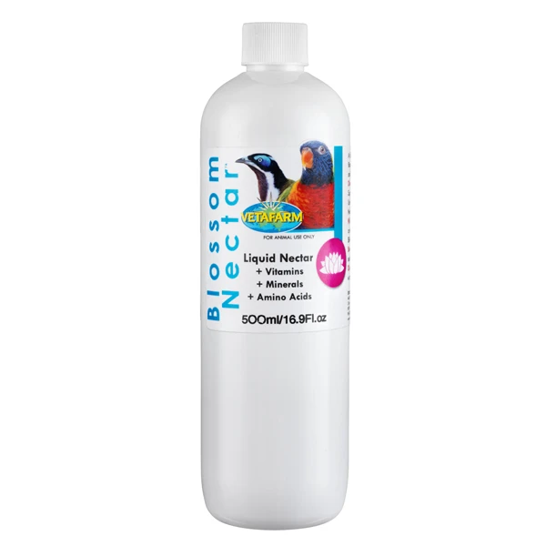 Vetafarm Blossom Nectar Liquid 500ml is a nutritious supplement for nectar eaters. Vetafarm Blossom Nectar Liquid 500ml is a sweet & nutritious liquid nectar that is easy and convenient to supply. Contains a blend of fructose, vitamins glucose, minerals, sucrose, and amino acids in a stabilized liquid formula.