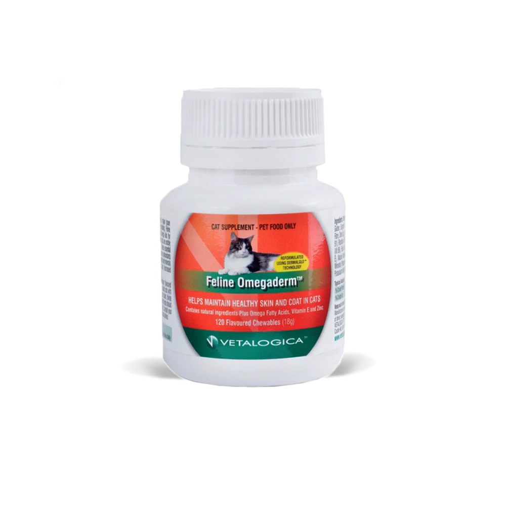 Vetalogica Canine Omegaderm and Feline Omegaderm contain a soothing formulation of omega oils, zinc, vitamin E and minerals to help maintain healthy skin and coat condition in dogs and cats. Omegaderm helps to replenish dry, flaky skin and manage shedding, which can assist with the control of hairball formation in cats.