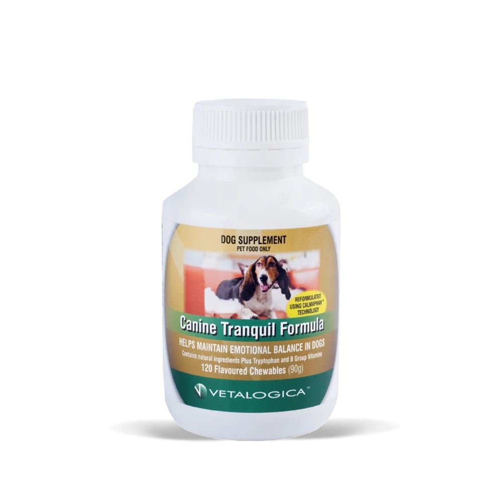 Canine Tranquil Formula contains Tryptophan and essential B group vitamins to help maintain normal emotional balance as well as normal nervous function in dogs.