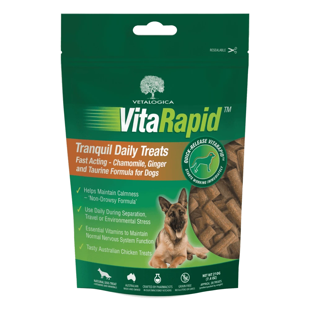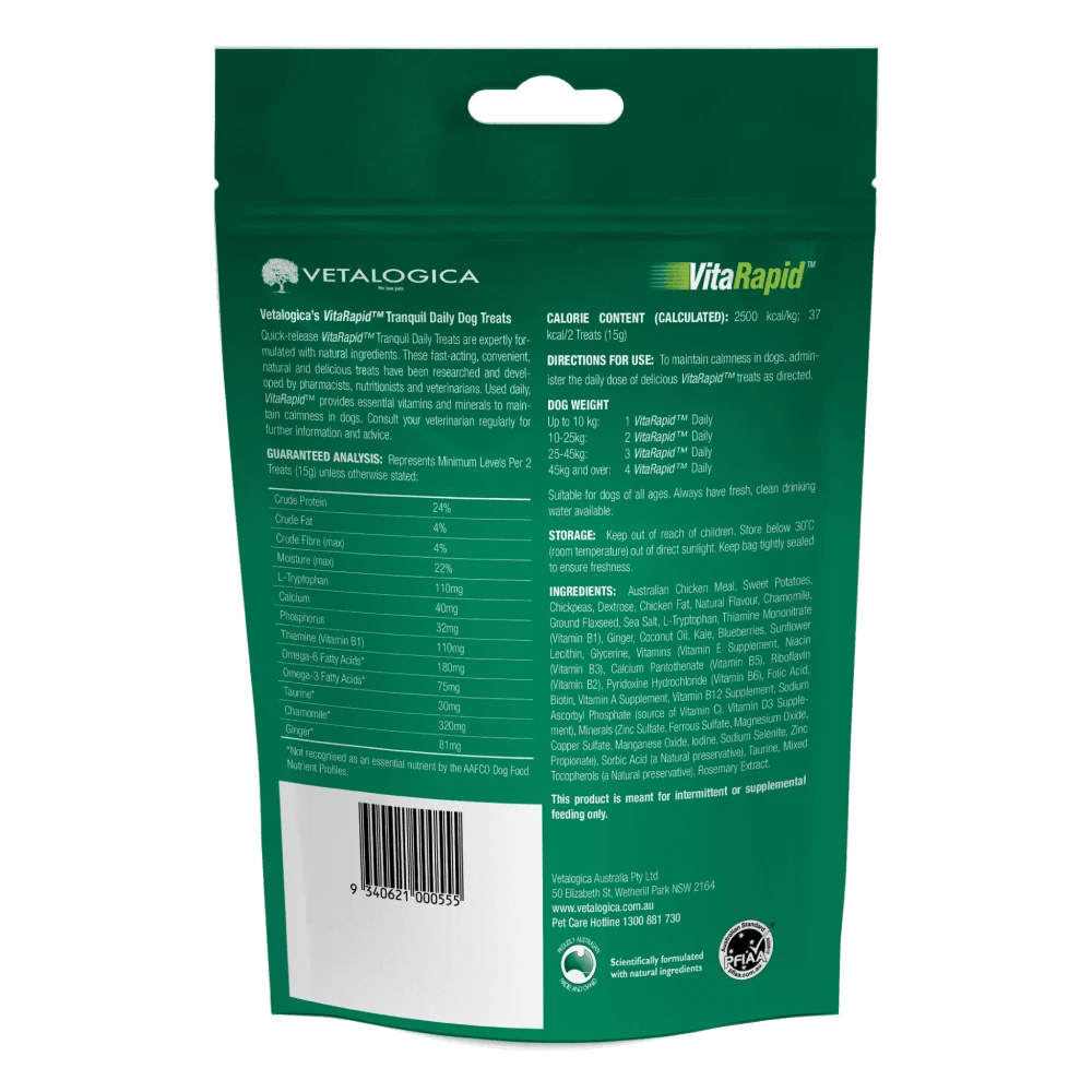 Quick-release VitaRapid® Tranquil formulation for dogs is scientifically blended with natural ingredients. This proprietary blend of chamomile, taurine, tryptophan, vitamins and omega oils in a synergistic blend, maintains normal nervous function for dogs in a convenient treat form with the added benefit of being fast acting. Vetalogica’s world exclusive VitaRapid® formulation is the result of numerous years of research and development by Scientists, Chemists, Veterinarians and Flavour Experts.