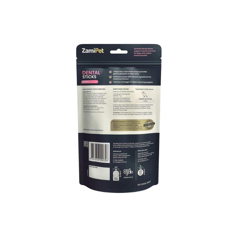 Introducing ZamiPet Dental Sticks Puppy 190g your answer to maintaining your beloved puppy’s dental health. These dental sticks are expertly engineered to encourage strong teeth and gums while satisfying your furry friend’s natural urge to chew. ZamiPet Dental Sticks Puppy is uniquely tailored to champion comprehensive oral health in young puppies. Not only that, it offers extra perks like Calcium and Omega-3 to ensure ideal growth and development. With the exclusive ZamiDental formulation, these dental sticks effectively combat plaque buildup and tackle unpleasant breath, leaving behind a clean and fresh mouth. The innovative four-leaf clover shape and textured surface delicately scour the teeth, delivering a mild abrasion action for meticulous cleansing. Gift your puppy the treasure of a vigorous smile with ZamiPet Dental Sticks Puppy!