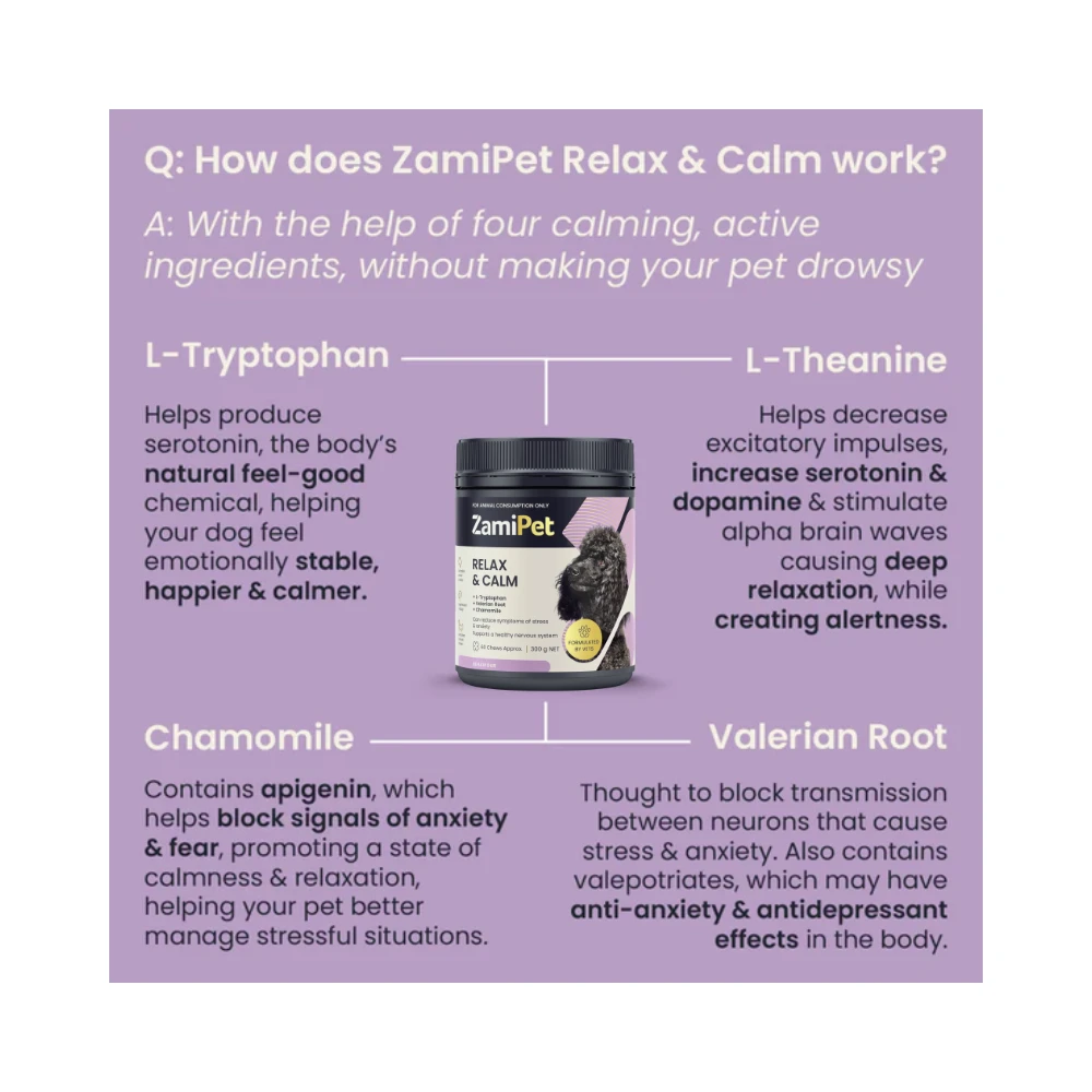 - Supports Relaxation: The distinctive blend of natural components in ZamiPet Relax & Calm Dog works harmoniously to promote relaxation, diminishing stress and unease for your pet.