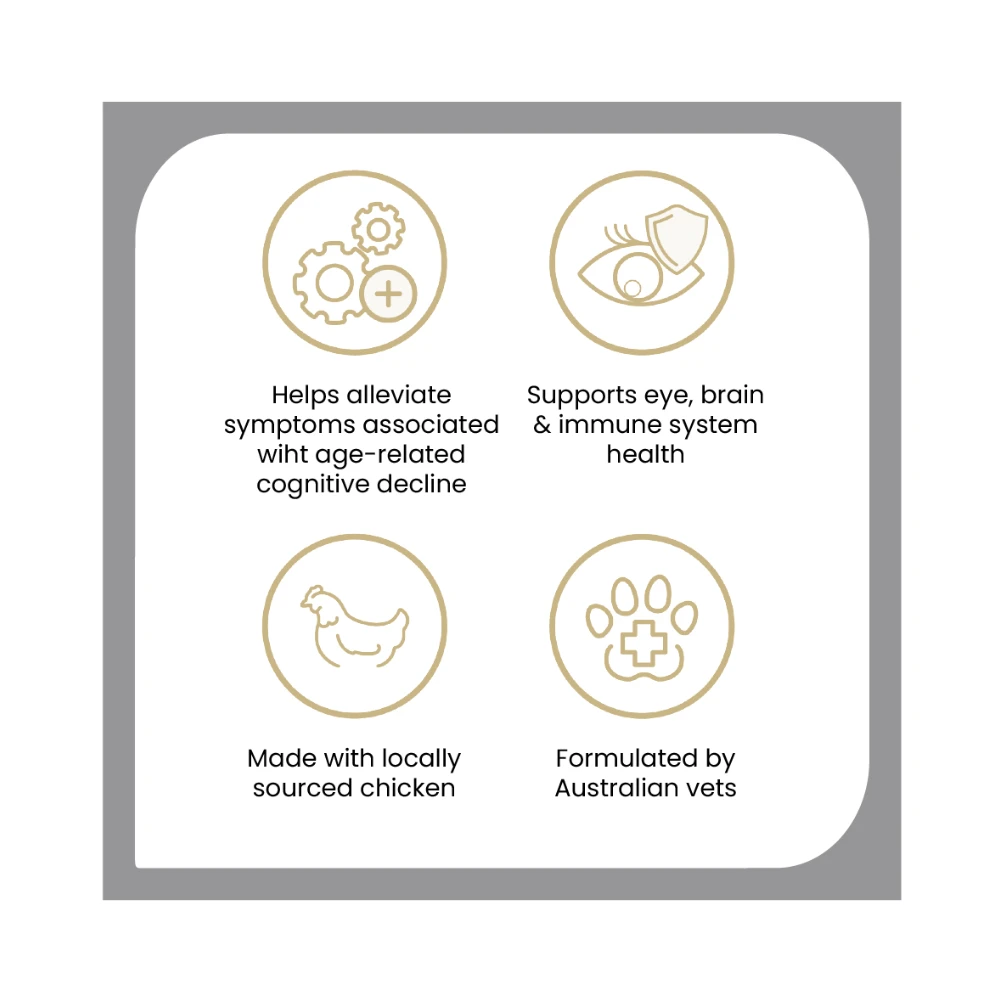 Australian Sourced Chicken Meal; Rice; Gelatine; Glycerol; Food Acid; Fish Oil (source of Omega-3); Natural Flavours; Salt; Emulsifier; Vitamin C; Magnesium Phosphate; Vegetable Protein Extract; Vitamin E; Potassium Sorbate; Calcium Carbonate; Zinc Sulphate; Phosphatidylserine; Lutein Extract; L-Carnitine; Turmeric Extract; Iron (Ferrous Sulphate); Natural Antioxidant; CoQ10; Copper Sulphate; Selenium; Vitamin B3 (Niacin); Manganese Oxide; Vitamin B2 (Riboflavin); Biotin; Vitamin B12; Vitamin B1 (Thiamine); Vitamin A; Vitamin B6; Folic Acid.